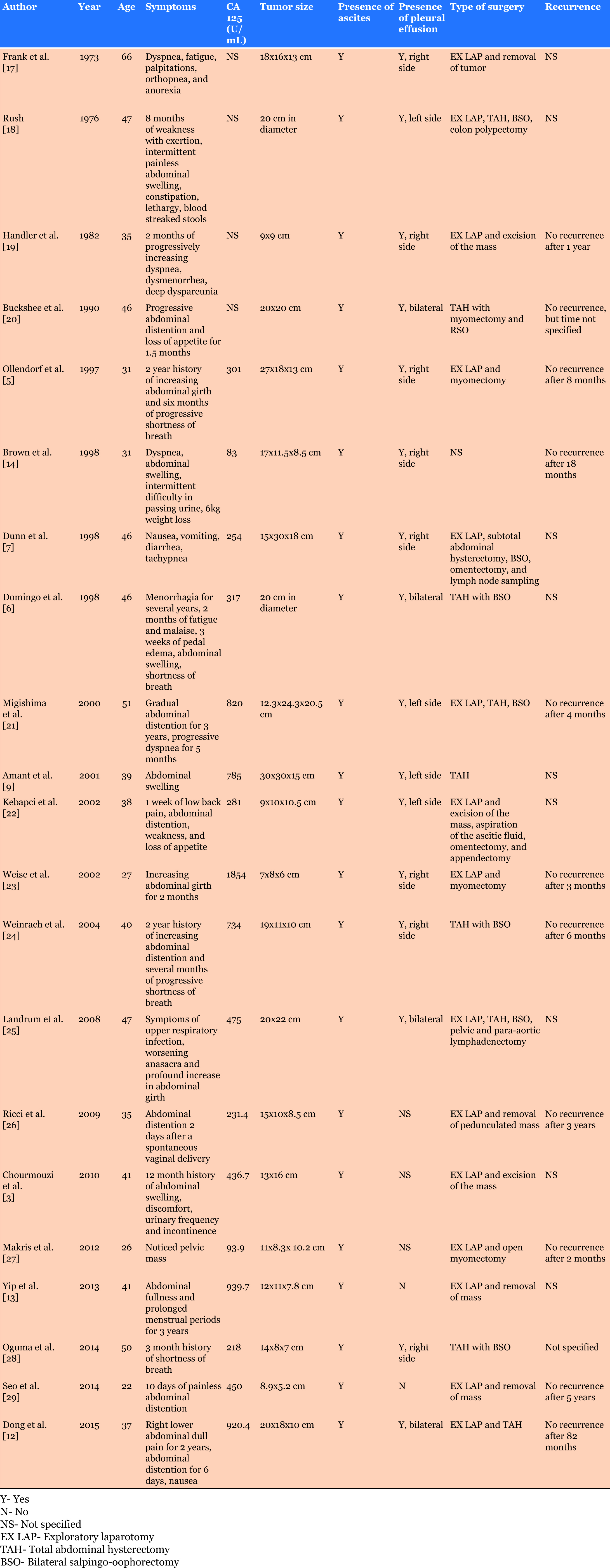 Ollendorff AT, Keh P, Hoff F, Lurain JR, Fishman DA. Leiomyoma causing massive ascites, right pleural effusion and respiratory distress: A case report. J Reprod Med 1997;42(9):609–12.