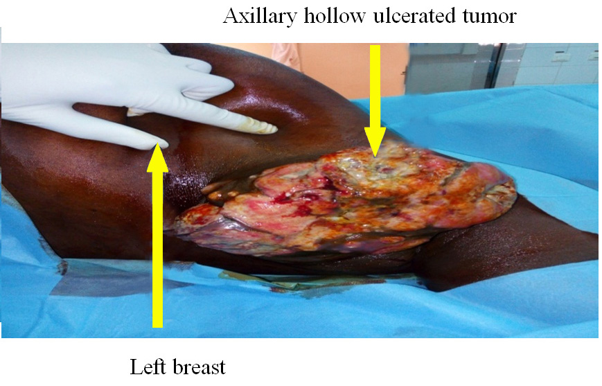 A 58-year-old diabetic patient on diet treatment only, gravida 10 para 9 with a history of exclusive breast feeding for 20 months of all her children. She was referred for an ulcerous-necrotic tumor of the left axillary extension. Examination at admission showed an ulcerous-necrotic mass of the left axillary extension fistulized at the skin (Figure 1). Comparative examination of the right axillary fossa found a supernumerary breast (Figure 2). Bilateral and comparative examination of the breasts was unremarkable.