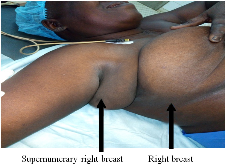 Conclusion: This case describes a rare diagnosis of tubularpapillary carcinoma on an ectopic breast of the axillary extension treated with neoadjuvant chemotherapy and a mastectomy of the supernumerary breast. As with breast cancers in our context, diagnosis is often made when the tumor is at an advanced stage making treatment more cumbersome and mutilating with lower chances of recovery.