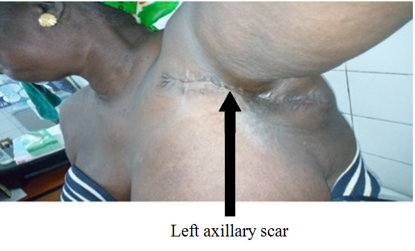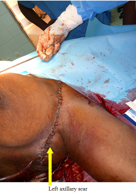 She benefited from neo adjuvant chemotherapy of adriamycin and cyclophosphamide AC type, six sessions with a partial response. Then a mastectomy associated with lymph node resection. A fusiform incision carrying all the supernumerary breast directed towards arm pit was realized dissecting up to the muscle. Then an opening of the clavi-pecto-axillary aponeurosis and curage of the two floors of BERG.Hemostasis was satisfactory and a Redon drain was placed in the mastectomy bed and closure achieved with separate stiches, and the specimen was sent to the histology laboratory (Figure 3).