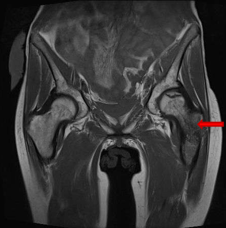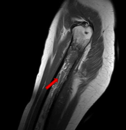 During her hospitalization time, she presented sudden and massive vaginal bleeding that caused hemorrhagic shock requiring Intensive Care Unit admission, strong hemodynamic support, blood transfusions, and uterine right artery embolization. Once recovered, she developed severe pain and inflammation on her left thigh. Femoral magnetic resonance image revealed significant signal alteration of femoral diaphysis, with cortical disruption and muscle edema, suggesting femoral osteomyelitis originated from adjacent infected soft tissues (Figure 9) and (Figure 10).