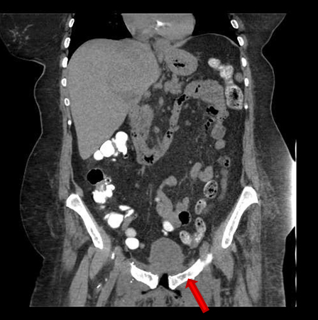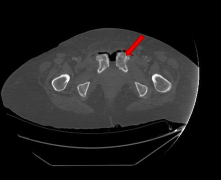 She presented on Emergency room suffering from fever, pelvic pain, and functional impairment of her right lower limb. Physical examination revealed bad smell vaginal flow and loss of strength on her right lower limb. Contrast computerized tomography and magnetic resonance images showed pelvic muscles impairment (Figure 1), inflamed bladder (Figure 2), and pelvic abscess lying from right psoas muscle to pubis bone, which presented radiologic signs of osteomyelitis (Figure 3) and (Figure 4).