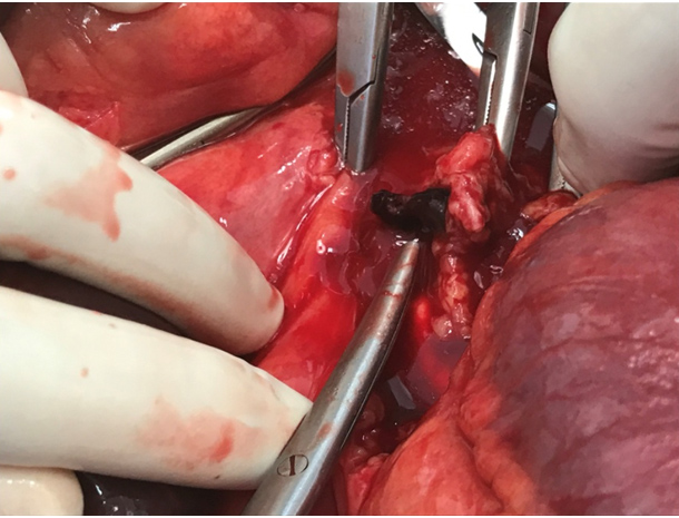 Intraoperative photographs were taken demonstrating the gangrenous nonviable small bowel loops before resection, shown by the clear demarcation in color change (Figure 1). During resection and anastomosis, a mesenteric venous branch was found to have a localized firm segment. Upon dissection of this vessel segment, a 1.5 cm venous thrombus was discovered occupying the lumen and was extracted (Figure 2).