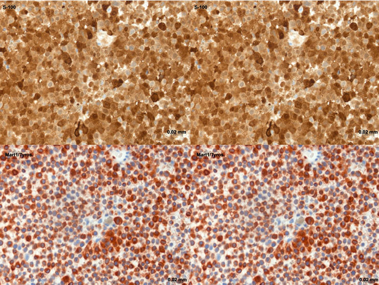 On gynecological examination the ventral vulva showed pigmented areas around the urethra and the labia minora with an extension toward and formation of a bulge in the dorsal vaginal wall. No further abnormalities were detected. A biopsy was taken to determine the entity of the vaginal tumor. A tumorous mass of approximately 5 cm in length and 3 cm in width was palpable in the middle third of the vagina extending as far as the upper third of the vagina. The tumor reached the outer layer of the rectal wall without affecting the mucosa. There were no palpably enlarged lymph nodes. On transvaginal ultrasound the tumor measured 6.6 × 3.2 cm (Figure 1). Abdominal ultrasound of the inguinal lymph nodes showed normal size and shape with no aspects of metastasis. On MRI scan the tumor size was confirmed in absence of distant metastasis (Figure 1). The department of pathology confirmed the diagnosis of a melanoma of the vagina in the biopsy taken. The additional positive immunostaging supported the diagnosis of a PMMV. Tumor cells expressed S-100 and MART 1/Tyros (Figure 2); CD 45 and MNF-116 were negative. Regarding the operative procedure, in order to achieve clear margins, a total exenteration would have been needed to be performed, due to the localization of the tumor close to the rectal wall and additional areas suspicious of melanoma in situ on the ventral vulva including the urethra. We discussed all the surgical options including the previously mentioned exenteration which would have resulted in a final colostomy and an ileum conduit, respectively. Due to her advanced age the patient denied complete oncological excision along with the associated implications.