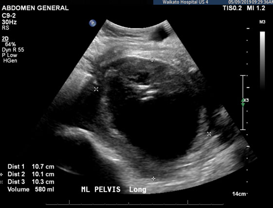 Medical management was commenced with prophylactic broad spectrum intravenous antibiotics. No surgical intervention was planned. The ileus resolved within 24 hours, and she was changed to oral antibiotics on Day 6. On Day 12 she developed worsening pain and abdominal distension. Transvaginal ultrasound demonstrated a large BFH measuring 12 × 8 × 11 cm (Figure 1). The following day she developed a fever and tachycardia. Broad spectrum intravenous antibiotics were recommenced and surgical drainage recommended.