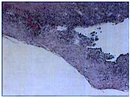 A 64-year-old, post-menopausal woman presented with a six-year history of copious, yellow vaginal discharge. For the past five years, she had been managing her menopausal symptoms with topical testosterone 1% 0.5 mg QD and an estrogen patch 0.0375 mg/QD twice weekly. She had tried the following treatments for the vaginal discharge without significant relief: oral metronidazole, azithromycin, topical metronidazole, fluconazole, topical estrogen, and clindamycin. Physical examination of the vulvar vestibule and urethral meatus revealed erythematous papules that were severely tender (Figure 1). Copious, yellow discharge was present in the vaginal vault with evidence of erythematous papules on the vaginal mucosa. The vaginal pH was 5.7 and many white blood cells (WBCs) and parabasal cells were noted on saline microscopy. Many small erythematous papules were noted on the cervix (Figure 2). A cervical biopsy was obtained with Tischler biopsy forceps. Histology showed cervical squamous epithelium with a lichenoid lymphoplasmacytic infiltrate (Figure 3), confirming a diagnosis of plasma cell cervicitis. She was instructed to vaginally insert 1 gram of estradiol 0.02%/hydrocortisone 10%/clindamycin 2% daily for four weeks, every other day for four weeks, then twice per week. After three months, she experienced complete resolution of her leukorrhea, microscopy of her vaginal discharge was normal with a pH of 4.5, and she had resolution of the erythema and papules on the vulvar vestibule, urethral meatus, and cervix.