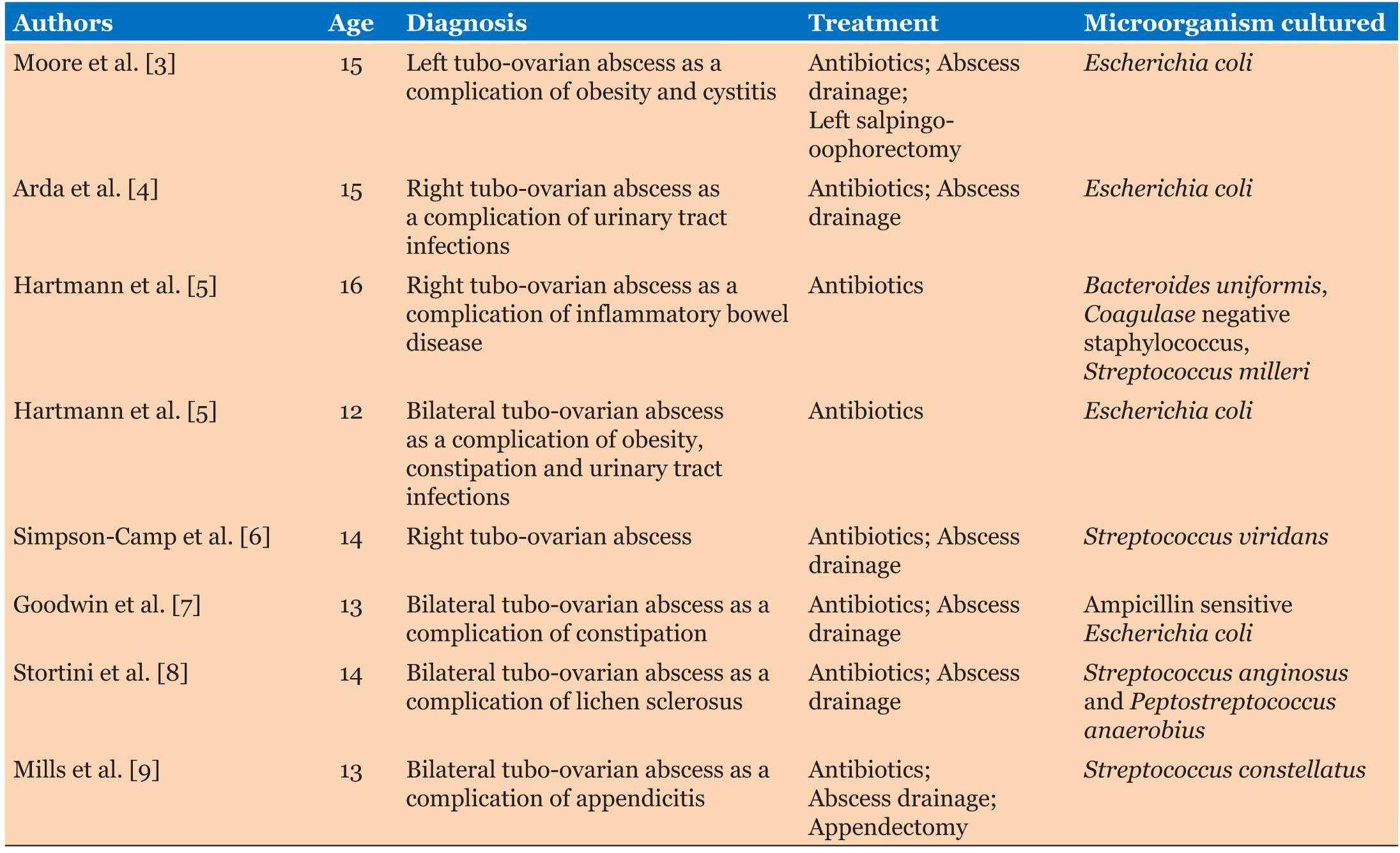 Although the majority of tubo-ovarian abscesses occur in sexually active patients, there are also documented cases of tubo-ovarian abscesses occurring in virgins and sexually inactive patients (Table 1), emphasizing the idea that sexual intercourse should not be considered a prerequisite in the development of tubo-ovarian abscesses [2],[3],[4],[5],[6],[7],[8],[9].