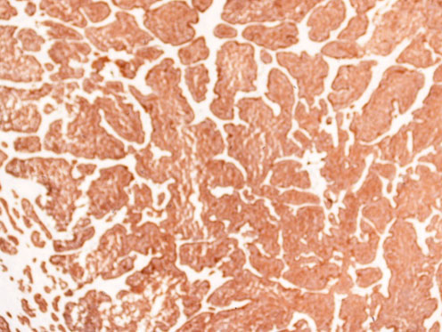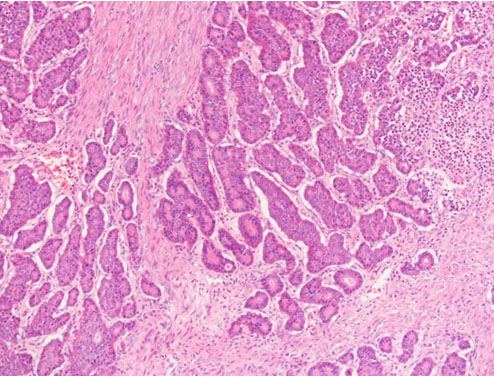 Sections of left ovary showed involvement by tumor tissue. The latter was composed of nests, acini, and trabeculae of tumor cells separated by dense fibrous tissue. The tumor cells featured low columnar to cuboidal cells with regular round nuclei, stippled chromatin, and eosinophilic cytoplasm with abundant red-brown granules. Mitosis was seen at less than 1/10 high power fields. Lymphoplasmacytic infiltrates were noted focally. Ovarian tissue was noted in the peripheral of tumor, and the ovarian capsule was intact (Figure 2 and Figure 3).
