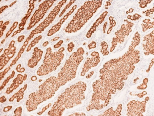 Immunohistochemically, the tumor cells were strongly positively positive for synaptophysin (Figure 4) and CDX-2 (Figure 5). Staining for TTF-1 or thyroglobulin was negative. Ki-67 proliferative index was <1%. The left fallopian tube was unremarkable.