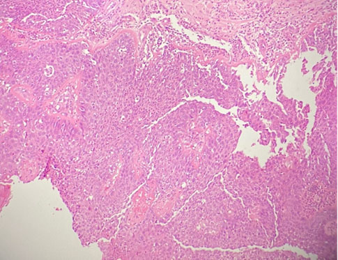 At some areas, the fibrous cyst wall and focal broad papillary structures were lined by thickened stratified squamous epithelium with loss of maturation, marked nuclear pleomorphism, occasional prominent nucleoli, and readily seen mitotic figures. There was no definite stromal invasion despite examination of multiple levels. No immature neuroepithelium or other immature element was seen. Features were those of squamous cell carcinoma in situ and carcinoid tumor arising from a mature cystic teratoma (Figure 8).