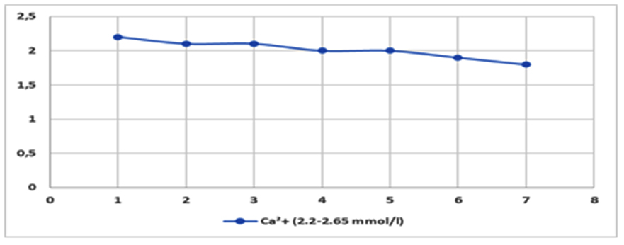 Hypocalcemia (ionized calcium 1.23 mmol/L) and hyponatremia (sodium 126 mmol/L) were confirmed by laboratory analysis as well as blood glucose 86 mg/dL, lactate 2.6 mmol/L, urine osmolality 287 mOsm/kg, sodium urine 32 mmol/L, and interleucin 6 84 pg/mL. We started an intravenous slow sodium correction as follows: [sodium deficit (set point) – sodium actual value × total body water × 0.3 = deficit of sodium in mmol/L] for 24–48 hours.