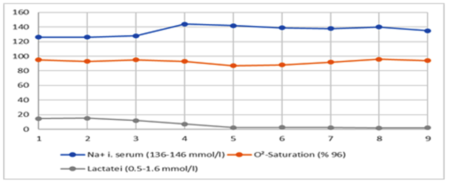 Due to the withdrawal symptoms, dexmedetomidine was administered after extubation therapy and therapy with ampicillin and gentamicin was carried out for 5 days which led to the control of cerebral edema stage II. The newborn was transferred to the Children’s Hospital in good general condition. Figure 3 shows sodium, lactate, and saturation changes for nine days.