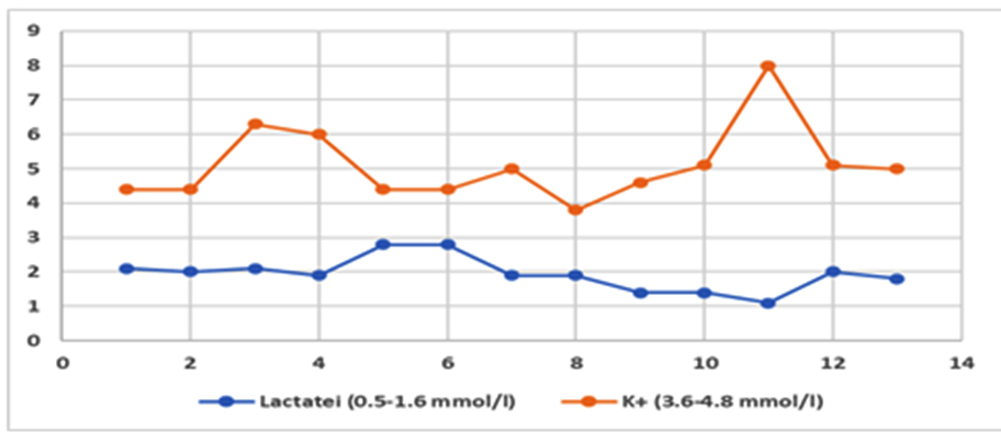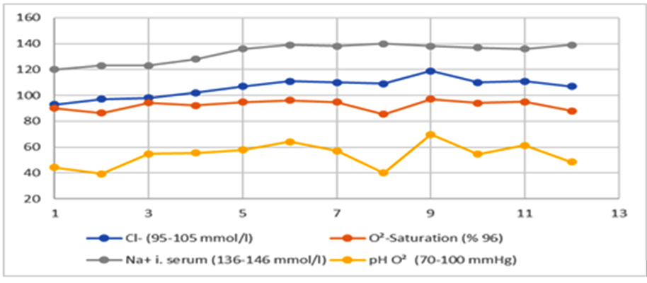 In the NICU, we observed seizures with staring gaze, changes in skin color, a drop in oxygen saturation and breathing difficulties. The amplitude-integrated electroencephalogram (aEEG) showed no evidence of focal or generalized convulsive activity. The severe hyponatremia was normalized by sodium substitution. In the further course the electrolytes were normal. The mother also had hyponatremia of 131 mmol/L, potassium value was 3.9 mmol/L at the time of delivery. We assume syndrome of inappropriate antidiuretic hormone (SIADH) symptoms were highly likely during childbirth. Figure 4 shows changes of potassium and lactate for thirteen days. Figure 5 shows the course of sodium, chloride concentration (mmol/L), saturation (%), and arterial pH blood gas analysis (mmHg) for 13 days.