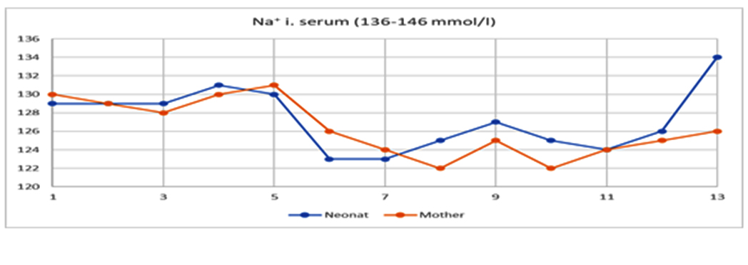 The umbilical cord blood gas analysis performed in delivery room showed hyponatremia (sodium 127 mmol/L), arterial pH 6.88, BE-25, lactate 14. The newborn was transferred to NICU, blood gas analysis performed showed hyponatremia, arterial pH 7.13, BE-19, lactate 16. The mother’s sodium was 126 mmol/L.
