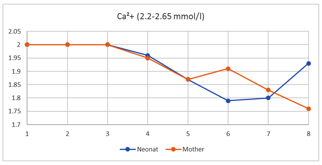 The maternal osmolality in serum was 277 mOsm/kg at day 3, 265 mOsm/kg at day 6, total protein in urine was 498 mg/24 h and sodium in urine was 53 mmol/L. The placenta showed a chorangiosis type I. Figure 6 shows maternal and neonatal serum sodium concentration (mmol/L) for 13 days and Figure 7 shows maternal and neonatal serum calcium concentration (mmol/L) for 8 days.