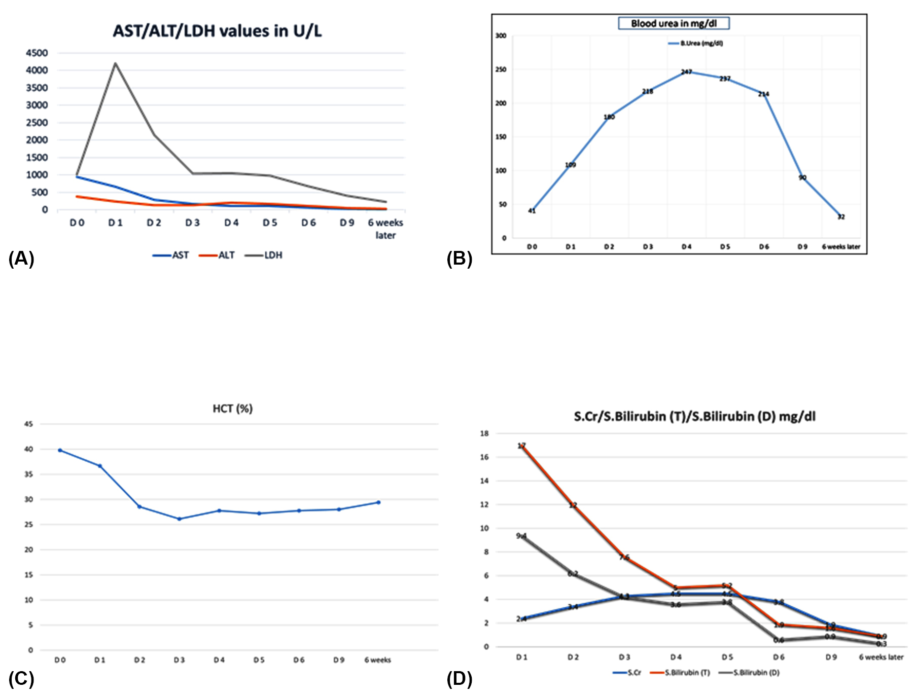 Her obstetric examination revealed an enlarged uterus consistent with 24 weeks gravid uterus size and was relaxed and non-tender. Fetal parts were felt on examination and fetal heart sounds were well heard with Doppler. Speculum examination was normal, there was no bleeding and the cervical findings did not show any signs of labor. Bedside urine examination showed 4+ proteinuria. As the PR was <70/min, oral nifedipine was started as an antihypertensive and MgSO4 was continued. Obstetric ultrasound showed a singleton live fetus of 14th centile growth with normal liquor and there was no evidence of abruption. Her laboratory parameters are given in Table 1. As there was an increase in serum bilirubin and liver enzymes with raised lactate dehydrogenase (LDH) values and normal platelet count, the working diagnosis was either severe PE/HELLP or AFLP. Her Swansea criteria score was 5 at the time of initial presentation. Her renal parameters were normal at admission, and output was adequate. The high risk was explained to the family members and a joint decision was taken for termination of pregnancy. Blood products were arranged. Pregnancy was terminated with a combination of the mechanical and pharmacological methods [Extra-amniotic saline infusion (EASI) and 2 doses of 200 mcg prostaglandin E1] and she delivered an alive female baby of 730 g with 5 minute APGAR of 6 within 12 hours of labor induction. The baby was shifted to neonatal intensive care unit (NICU) level III and succumbed on post-natal day 3 due to prematurity and sepsis. Subsequently, on post-natal day 1, there was a gradual worsening in the renal function with development of an anuria and later in another few days liver function too deteriorated slowly following delivery. The absence of coagulopathy and hypoglycemia (though occur in a minority of patients, refractory hypoglycemia points toward AFLP) during the hospital stay ruled out the possibility of AFLP. The peripheral smear showed normocytic normochromic RBCs (red blood cells) and platelet in clumps. The reticulocyte and haptoglobin values were also suggestive of hemolysis. Subsequently, the clinical course was complicated with a fall in hemoglobin, thrombocytopenia, and neutrophilic leukocytosis with toxic changes which led us to initiate the workup for sepsis and TMA (thrombotic microangiopathy). Urine microscopic examination showed 20–22 RBCs/HPF (high power field), few bacteria and granular casts. Her coagulation profile was normal throughout the stay. The renal function continued to worsen, however she responded to diuretics. Supportive measures were given, she was on broad spectrum antibiotics and hypertension was under control. She received intravenous Dexamethasone 10 mg twice daily for 5 days. The persistent conjugated (direct) hyperbilirubinemia following delivery made us to initiate the workup for the infective causes of jaundice. Though there was an improvement in LDH, serum bilirubin, and liver enzymes, the clinical picture was worsening in terms of AKI and low platelet count. Her C3 and C4 levels were normal; anti-nuclear antibodies (ANA) and anti-phospholipid antibody (APLA) also were negative. The workup for immune hemolytic anemia was negative. Ultrasound (USG) abdomen showed mild coarsened liver echoes and signs of bilateral medical renal disease. Since the platelet count did not show any significant reduction and serum creatinine was steadily rising, she was planned for plasma exchange in discussion with nephrologist and immunologist. Meanwhile, the sepsis and febrile panel (as peripheral smear showed neutrophil leukocytosis with toxic changes and fever on postpartum day 2) workup revealed real-time PCR positive for scrub typhus and other infective etiologies including viral hepatitis were negative. She was started on oral doxycycline 100 mg twice daily for 7 days. A thorough examination did not reveal any eschar at classical sites. She started showing recovery in terms of reduction in the level of serum creatinine and the platelet count started improving 48 hours after starting doxycycline. Plasma exchange was deferred, and she was discharged after 11 days of hospital stay. Arterial blood gas analysis revealed mild metabolic acidosis in the immediate postpartum period however the Glasgow coma scale (GCS) remained 13–15/15 and never required ventilatory support during the entire course of hospital stay. She developed transient hyperglycemia during the hospital stay which required insulin supplementation. At 8 weeks postpartum she was doing well with no residual renal or hepatic dysfunction. The trend of LDH, platelet count, hematocrit, blood urea, serum creatinine, liver enzymes, and serum bilirubin during the hospital stay is given in Figure 1.