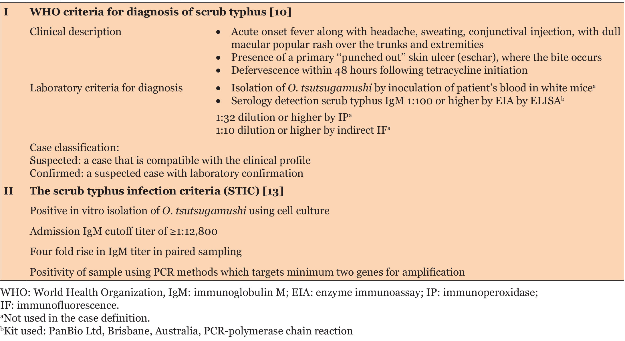 Scrub typhus was first diagnosed in 1899 in Japan and was considered one of the dreaded diseases during the Second World War in pre-antibiotic era. The first outbreak in India was from Assam and West Bengal [8]. Globally, almost 100 billion people are at risk every year and it is more prevalent in the tsutsugamushi belt which extends from Japan to Russia and Australia to Pakistan. Scrub typhus is often under diagnosed even in the endemic areas due to a lack of diagnostic facilities. There can be seasonal variation in the incidence of scrub typhus as 80% of the cases of scrub typhus occur during summer/autumn. Our patient also presented in the later part of summer and our region is an endemic area for scrub typhus. The presentation in pregnant women is similar to non-pregnant state and is characterized by fever, chills, vomiting, abdominal pain, and headache. Table 2 describes the World Health Organization (WHO) diagnostic criteria for scrub typhus and scrub typhus infection criteria (STIC) [10],[12],[13]. As a direct method, real time polymerase chain reaction for the diagnosis of scrub typhus has more sensitivity and specificity compared to indirect methods used however cost is the limiting factor [12]. Eschar formation, 5–20 mm necrotic lesion at the site of bite or ulcer with regional lymphadenopathy is the single most important clue for the diagnosis but their presence can be highly variable (7–97%) [7]. The common sites are groin, axilla, chest, and lower back; however the clinical experience of the medical personnel and color of the skin are the factors that influence its recognition. Even in our patient a detailed examination after the diagnosis of scrub typhus could not identify the eschar. Abdominal pain due to vasculitis is common in women with scrub typhus which is likely to get missed in pregnant women as the symptom has a variety of causes. There is evidence for the deposition of O. tsutsugamushi in endothelial cells which is supported by positive immunohistochemistry for its antigen. Almost 30% of the individuals go on to develop one organ dysfunction if untreated and the most common being AKI or acute hepatic failure (AHF) [7],[11],[12],[13],[14],[15].