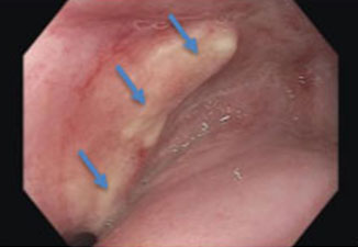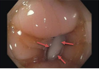 A 74-year-old woman with history of stage I uterine prolapse with daily Gellhorn pessary use for 12 years and constipation with weekly suppository use presented with 7 days of stool on her pessary. Physical examination revealed an afebrile female with a benign abdomen and stool at the vaginal introitus. Laboratory examination revealed a normal white blood cells (WBC) count, and a urinalysis with positive leukocyte esterase, nitrite, and white and red blood cells. Computed tomography (CT) demonstrated contrast in the rectal vault and at the level of the vaginal introitus as well as distal colonic diverticula (Figure 1). Colonoscopy findings are given in Figure 2, Figure 3, Figure 4. During colonoscopy, the scope passed through the anterior rectal wall through a tract into the vagina and out to the bed (Figure 2). A 2 cm opening on the anterior rectal wall (red arrows, Figure 3) and a mature fistula tract (Figure 4) with granulation tissue (blue arrows) were visualized. The opening was treated with argon plasma coagulation and an over-the-scope-clip was placed. This resulted in >90% improvement in patients’ symptoms immediately and allowed for hospital discharge.