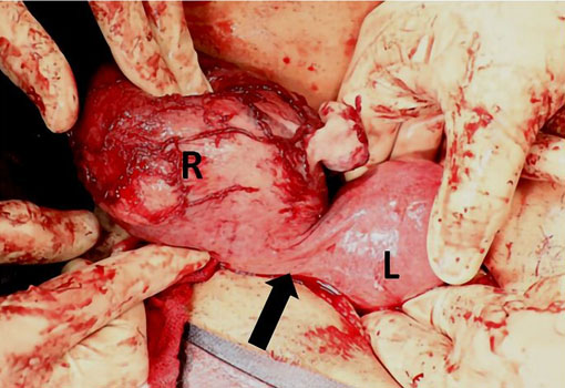 These findings were presented to the patient emphasizing the complexity of and risk for maintaining such pregnancy, including risk of uterine rupture, and the unfavorable prognosis of the fetus. The patient requested termination of the pregnancy. After approval of the patient’s request by the hospital’s pregnancy termination committee, feticide was performed by potassium chloride injection [10 mmol/L (0.75 g) in 10 mL] into the fetal heart with sonographic guidance. The patient underwent a right hemi-hysterectomy and right salpingectomy (Figure 3). Severe intrauterine growth retardation that was diagnosed by ultrasound prenatally was confirmed at surgery. One year later, the patient became pregnant within the main uterine horn, now entering her third trimester of that pregnancy uneventfully at the time of this writing.