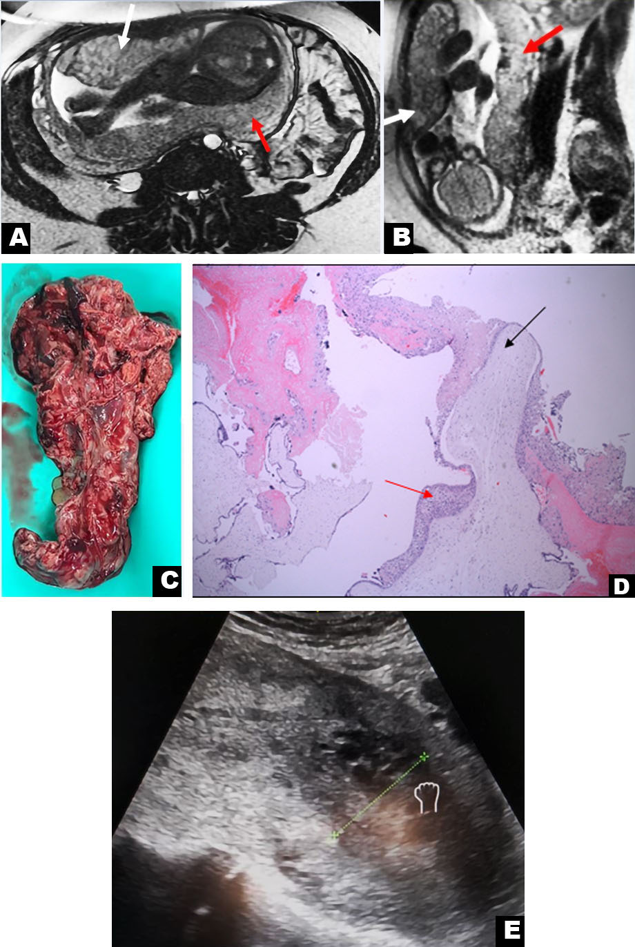 Obstetrical US at 22 weeks and 5 days gestational age for fetal survey revealed a single male fetus in vertex position with a posterior placenta free of the cervical os. Growth, fetal survey, and a biophysical profile were normal. An anterior mural based multi-cystic lenticular shaped uterine mass measuring 11.8 cm long × 4.2 cm AP × 12.8 cm W was completely separate from the posterior placenta in the gestational sac of the live fetus. Color Doppler evaluation showed prominent vascularity within the mass (Figure 1A and Figure 1B).