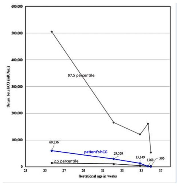 Gestational trophoblastic disease includes a broad spectrum of findings ranging from complete and partial hydatidiform mole to placental site trophoblastic tumor, chorioadenoma destruens, and choriocarcinoma. Complete hydatidiform mole with a coexisting live fetus is one of the rarest presentations of trophoblastic disease [10]. It is even more unusual with a normal hCG for gestational age.