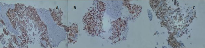 An axillary lymph node biopsy showed tumor proliferation arranged in spans and clumps and sometimes papillae. Tumor cells were pleomorphic with large hyperchromatic nuclei and a high nucleocytoplasmic ratio (Figure 2).