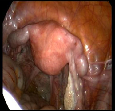A 45-year-old para 3+0 female with history of sterilization by Filshie clips soon after her last delivery 17 years ago presented with heavy menstrual bleeding resulting in anemia which required iron supplement. Diagnostic hysteroscopy showed a normal uterine cavity with a 7 cm length and endometrial biopsy was benign. Treatment options were discussed with the patient and she opted for endometrial ablation. Four months after the procedure, she presented to accident and emergency (A & E) with continuous and excruciating pelvic pain responding only to morphine. This affected her quality of life and she was unable to perform her daily duties. She was seen in A & E multiple times and was eventually referred to the surgical team due to the fact that she also reported a change in her bowel habit. A colonoscopy was performed and it was normal and she was referred to the gynecology team. An ultrasound revealed avascular internal echoes within the myometrial cavity and another anechoic cystic area adjacent to the endometrial cavity as well as a posterior wall intramural fibroid measuring 22 mm (Figure 1).