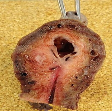 After a discussion with the gynecologist, the patient opted for a total laparoscopic hysterectomy and bilateral salpingo-oophorectomy. Intra-operative findings included bilaterally dilated tubes with Filshie clips but apart from a small posterior wall uterine fibroid, the uterus appeared grossly normal in external appearance (Figure 2). Histopathology examination revealed that there was a cystic area at the fundus lined by a thin layer of endometrial epithelium and scarring in the isthmic region of the endometrial cavity with cornual hematometra consistent with PATSS (Figure 3). She did well post-operatively with resolution of her pain.