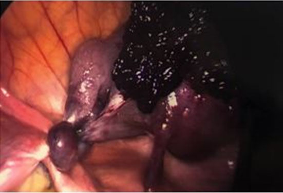 Based on the abdominal exam findings and hydrosalpinx noted on imaging, the decision was made to proceed with diagnostic laparoscopy. On laparoscopic survey, the bilateral ovaries and the right fallopian tube appeared normal. The left fallopian tube was found to be torsed three times, dusky in appearance, enlarged, and distended with old blood (Figure 2). After detorsion of the tube, there was no improvement in its appearance, and the decision was made to proceed with left salpingectomy. The procedure was uncomplicated with an estimated blood loss of less than 10 mL. The patient did well postoperatively and was discharged on postoperative day 0. The left fallopian tube was sent to pathology and the final pathology diagnosis confirmed hematosalpinx with torsion.