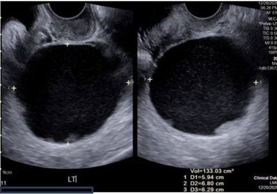 Pelvic ultrasound showed normal appearing ovaries without sonographic evidence of ovarian torsion. Color flow and spectral Doppler demonstrated normal arterial and venous blood flow and waveforms in the bilateral ovaries. Medial and adjacent to the left ovary was an elongated anechoic cystic structure measuring 4.85 × 5.45 × 3.58 cm (Figure 1). Further imaging was performed to rule out other causes of acute abdomen. Computed tomography (CT) of the abdomen and pelvis showed no acute abdominal or pelvic process, small volume pelvic ascites and redemonstrated the small to moderate sized left hydrosalpinx. The gynecology service was then consulted for further evaluation and recommendations for management.