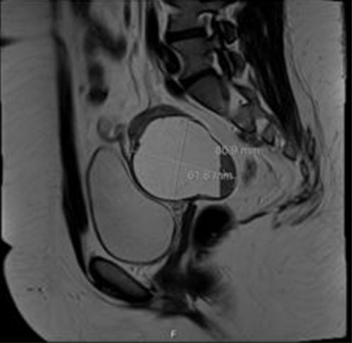 A pelvic ultrasound demonstrated normal arterial and venous flow and waveform to the left ovary. Right ovary was surgically absent. As shown in Figure 3, a complex 5.9 × 6.8 × 6.29 cm left adnexal/pelvic cul-de-sac cyst was seen which demonstrated mobile low-level echoes and an echogenic, avascular solid component peripherally. Further imaging was obtained. Magnetic resonance imaging (MRI) of the abdomen and pelvis showed an 8 cm left adnexal cystic mass favored to represent large hematosalpinx (Figure 4), with slight thickening of the right uterosacral ligament which may be related to endometriosis.