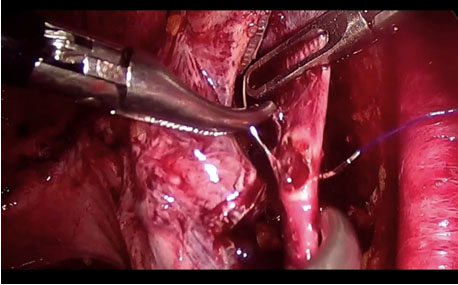 A 57-year-old white woman was referred to our division for incomplete surgically staged endometrial cancer. She was taken to the operating room for laparoscopic surgical staging. Incidental right external vein injury occurred during pelvic lymphadenectomy.