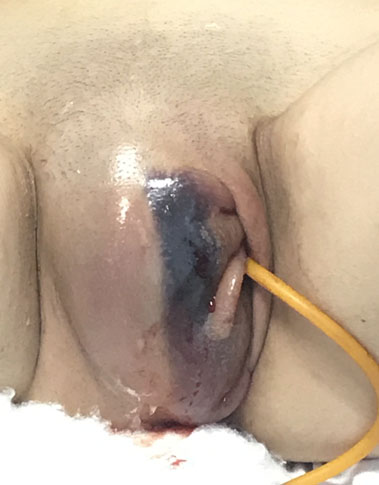 Under spinal anesthesia, a vertical incision was performed over the point of maximal protrusion on the right labia, in order to evacuate hematoma. After evacuation of multiple blood clots (>500 mL) the space created by hematoma was reapproximated using five interrupted sutures (polyglactin 910) without draining or packing the hematoma cavity. No sign of further bleeding was observed (Figure 3).