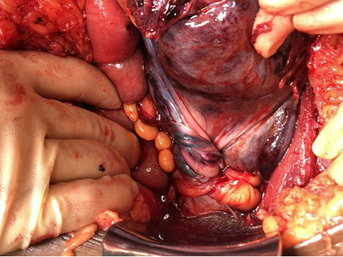 The fibroid was exteriorized and a myomectomy was performed. This revealed torsion of the uterus and adnexa by 720° clockwise on the isthmus of the uterus, with evidence of congestion and edema (Figure 2). The pelvic organs were detorted and conserved. The bowel was noted to be dilated but there were no signs of obstruction. Adhesiolysis was performed and a nasogastric tube inserted due to high risk of ileus.