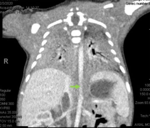 On post-op day 1, the mother restarted her LMWH and was recovering well. On day 1 of life, the neonate underwent an ultrasound showing a similar appearing focal non-occlusive clot. On day 2 of life, there were no intracardiac clots visualized on the echocardiogram and PGE was stopped. On post-op day 3, the mother was discharged home. On day 3 of life, a computed tomography (CT) angiograph was performed and it was determined that the clot seemed to be recently formed, was deforming the IVC, and was not well attached to the vessel wall because there was blood flow around it, thus raising concern for embolization risk (Figure 4).