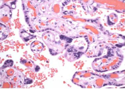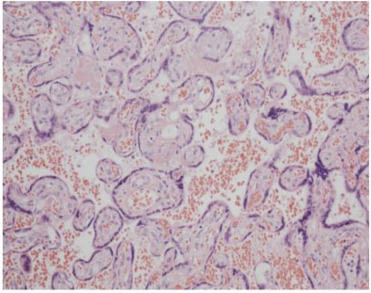 This is a case of a 26-year-old now G1P0104 woman with three years of anovulatory infertility. She became pregnant through controlled ovarian stimulation at the completion of her third cycle of clomiphene citrate and the pregnancy resulted in quadruplets. She had a prolonged history of symptomatic uterine contractions resulting in a hospitalization from 26 to 31 weeks. However, she underwent urgent cesarean delivery due to non-reassuring biophysical profile of one of the quadruplets. She was delivered of four live neonates; three females and one male. The placenta retrieved (Figure 1) showed widespread Tenney-Parker changes upon histologic examination. Figure 2 depicts the widespread Tenney-Parker changes in the retrieved placenta, but Figure 3 shows a normal placenta histology for comparison. Multifetal pregnancies are often associated with increased pregnancy complications, adverse perinatal outcomes, and increased maternal morbidity. Women with multifetal pregnancy are 6 times more likely to have a premature delivery and 13 times more likely to deliver before 32 weeks [4]. There is also an increased risk of short- and long-term neonatal and infant morbidity associated with multifetal gestations.