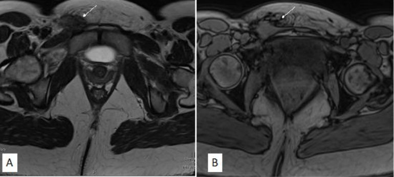 The diagnostic workup of inguinal endometriosis should entail a physical examination and imaging (such as ultrasound, CT, or MRI) [3]. Ultrasound is typically used as a first line imaging modality, as it may be used to rule out hernia. However, the appearance of inguinal endometriosis on ultrasound may be variable, including solid masses, cystic masses, and combined cystic and solid masses [9]. Magnetic resonance imaging can be particularly useful for identifying distinct characteristics, such as the presence of iron in the hemosiderin deposits contained in hemorrhagic micro-cysts in T1-weighted images [10]. Biopsy or fine needle aspiration may be performed, provided that a diagnosis of hernia is ruled out, and is useful for confirmation of the diagnosis.