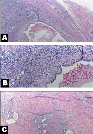 Diagnostic laparoscopy was performed to assess for the presence and degree of abdominal endometriosis, with specific consideration paid to evaluating the round ligament and internal inguinal ring to ensure a clear margin and complete excision of the inguinal endometrioma. Laparoscopy revealed Stage I intra-pelvic endometriosis, with less than 1-cm lesions on the left ovary and uterosacral ligament. The round ligament and internal inguinal ring were assessed for involvement with the inguinal mass and were noted to be without evidence of endometriosis. In the inguinal region, an incision was made at the inguinal ligament and taken down to the superficial fascia using electrocautery to minimize bleeding. The mass was densely adhered to the pubic symphysis and external oblique aponeurosis. Moreover, the mass appeared to involve adjacent vessels, nerves, and muscles. The mass was progressively mobilized from the superficial inguinal ring superiorly, sartorius muscle laterally, and adductor longus muscle medially. The superficial epigastric vessel and several perforating branches of the femoral vein (including the saphenous, superficial epigastric, and superficial external pudendal veins) as well as the round ligament of the uterus, at the level of the external inguinal ring, were ligated and tied to free the mass from the surrounding tissue. Due to tumor involvement, the ilioinguinal nerve was intentionally cut. The mass was removed en bloc, and the resected bed fulgurated to ablate residual microscopic lesions of endometriotic tissue. The integrity of the abdominal wall was assessed by a general surgeon. The facial defect was adequately repaired via a primary closure in multiple layers, without the need for a mesh. The technical steps of management and resection of an inguinal endometrioma have been detailed in the video with an emphasis on anatomic landmarks by utilizing visual illustrations (Video 1). Final pathology confirmed extensive inguinal endometriosis, characterized by foci of benign endometrial glands and stroma within smooth muscle and fibroadipose tissue. One lymph node accompanying the specimen also demonstrated focal endometriosis (Figure 3). Positive CD10 immunostaining highlighting the endometrial stroma supported the diagnosis.