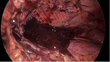 Exploratory laparoscopy was performed which demonstrated hemoperitoneum and free floating mesh with purulent fluid consistent with infected mesh. Omental-uterine adhesions were noted over the previous hysterotomy which appeared to be the source of hemoperitoneum (Figure 3). Lysis of adhesions was performed and the mesh was removed. The procedure went without any complications and the patient was sent to recovery in stable condition. She received postoperative antibiotics for intra-abdominal infection. Postoperatively she did well and was stable for discharge home on postoperative day five.