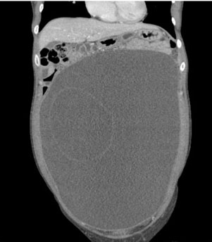 A 32-year-old nulliparous female presented to the emergency room reporting increasing abdominal fullness and discomfort. A computed tomography (CT) scan identified a 34 × 16 × 26-cm fluid filled cystic lesion likely arising from the left adnexa with a few thin septations (Figure 1 and Figure 2). There was mild ascites without peritoneal thickening or nodularity.