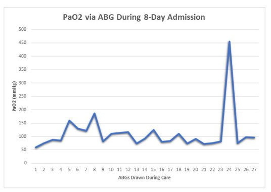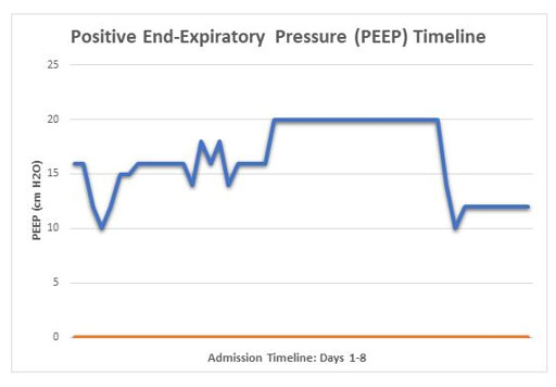 The patient was anxious, tachypneic with an SpO2 of 37%, febrile, and physical exam revealed bilateral rhonchi. She was placed on supplemental oxygen at 15 liters with minimal improvement of her oxygen saturation. Computed tomography (CT) scan of the chest showed diffuse ground glass opacities (Figure 1) and due to her worsening respiratory status, she was admitted to the intensive care unit for management and was intubated upon arrival to her room. She was started on high dose dexamethasone, remdesivir, and required norepinephrine for hemodynamic support. Continuous fetal monitoring and an increased steroid dose for lung maturity in case of early delivery were recommended by the Obstetrics team. With the patient’s PaO2 being of concern, she received many arterial blood gas analyses (ABGs) during her care, with a total of 27 ABGs analyzed (Figure 2). These results were consistent with COVID sepsis and acute hypoxic respiratory failure. The patient’s positive end-expiratory pressure (PEEP) (Figure 3) and oxygen requirements continued to rise with little improvement in clinical status, so the decision was made to start her on a paralytic infusion as well as place her in a semi-prone position (Figure 4) to allow for continuous fetal monitoring and uterine displacement. Initially, oxygenation improved with the semi-prone position. However, on hospital day 7, significant subcutaneous emphysema was noted as well as the continuous need for a PEEP value of 20 cmH2O and 100% FiO2 to maintain appropriate oxygenation.