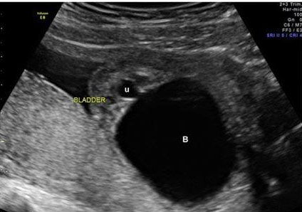 In order to differentiate between a dilated loop of bowel and hydroureter, observe bowel peristalsis [25]. If a unilateral hydroureter is found, examine the bladder and contralateral collecting system. Follow up with serial ultrasound examinations. It may also be beneficial to consult pediatric nephrology or urology to form a plan on postnatal evaluation (Figure 9).