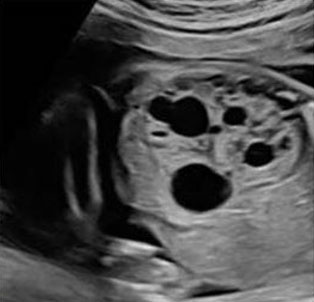 Axial and longitudinal views of the kidney as a part of routine anatomy scans are best for identifying MCDK. Follow-up every 3–4 weeks is recommended to watch contralateral kidney for development of anomalies and monitor the size of the cysts as they may increase. Amniotic fluid should also be followed very carefully as that could give indicators to contralateral anomalies. Magnetic resonance imaging may be helpful in complicated cases.