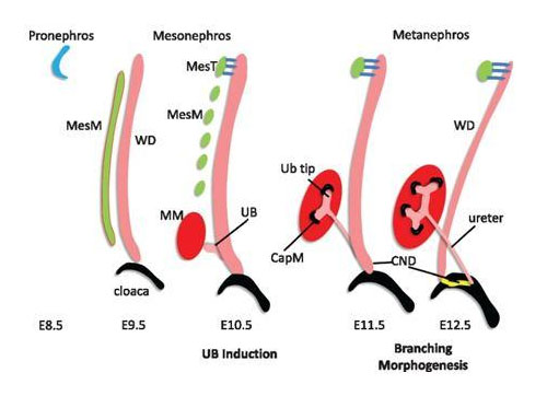Kidney development is a multistage process that begins in the anterior tract and then moves posteriorly [1]. First, the nephric duct forms (embryonic day 22 in humans) in the intermediate mesoderm inducing kidney development in three stages: the pronephros, the mesonephros, and the metanephros [1],[6] (Figure 2). The pronephros and mesonephros degenerate while the metanephros gives rise the mature kidneys via a series of divisions and branching, which can be detected at the fifth or sixth week of gestation. The ureteric bud arises as an outpouching from the nephric duct which becomes the ureter. By the eighth week of gestation the fetal kidneys will have ascended from the pelvis to the retroperitoneal fossa and rotated medially 90° [6].