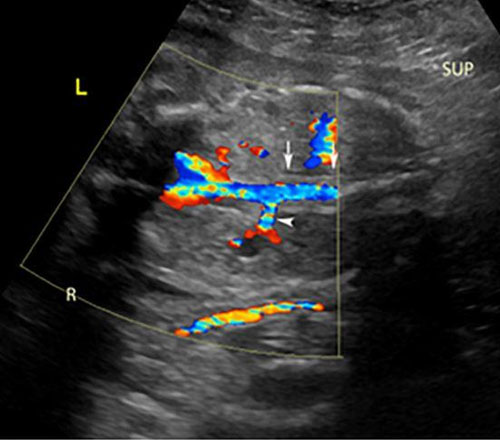 Horseshoe kidneys are often identified incidentally by a variety of imaging modalities such as ultrasound, CT, or MRI. Third trimester evaluation of the fetal kidneys in the coronal plane will provide the most accurate visualization of kidney orientation. Ultrasound evaluation may reveal fusion of medially rotated lower poles connected by bridging tissue called the isthmus (Figure 4). Horseshoe kidneys are usually found lower within the pelvis than the normal anatomic location and are typically bent or curved. Color Doppler will indicate a variance in blood supply. Magnetic resonance imaging is rarely needed unless ultrasound is inconclusive.