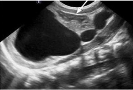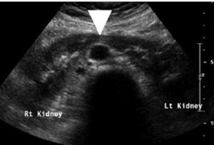 The best diagnostic clue is a dilated upper collecting system and a ureterocele within the urinary bladder (Figure 7). Kidneys should be evaluated in transverse and longitudinal planes (Figure 8).
