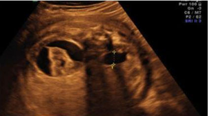 The hydroureter will present as tortuous and tubular in the fetal pelvis, the presence of a dilated ureter on ultrasound is an abnormal finding (Figure 9). The hydroureter may communicate with the kidney, bladder, or both.