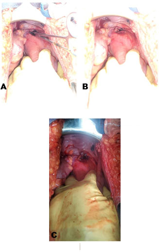 Intraoperative findings included a hemoperitoneum of 600 mL with clots, and an 8 cm longitudinal defect in the lower segment of the anterior uterine wall (Figure 4A, Figure 4B, Figure 4C). Upon discovery of this defect, the on-call obstetrics team was consulted, and they led in its repair. The bladder was found to be adherent to the notably paperthin lower uterine segment. Pieces of fetal membranes were seen in the uterine cavity. The membranes and clots were removed from the cavity, the bladder was dissected off the lower uterine segment and the uterine defect was repaired using a 2-0 polyglactin 910 (Vicryl®) continuous suture. A single layer only was able to be used, owing to how thin the uterus was. Closure of the rectus sheath, subcutaneous fat, and skin were performed with 1 polydioxanone, 1 polyglactin 910 (Vicryl®), and 3-0 polypropylene (Prolene®) respectively.