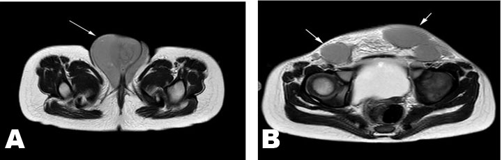 A 3.5-year-old girl was brought with the complaint of swelling in the vulvar area (The size of the vulvar swelling was 63×63×72 mm). Two years ago, she was diagnosed with infant ALL (CD10 60%, CD19 80%, B ALL, cerebrospinal fluid normal, genetic 15% cells in 11q23) and AALL0631 chemotherapy protocol was applied. While the patient had bone marrow remission in the 6th month of chemotherapy, the parents rejected chemotherapy. Two years after stopping chemotherapy for insufficient duration, the patient was brought with findings of infiltration in the vulvar area (genitomegaly, EMR, and bone marrow in remission). On physical examination, her general condition was good and she was active. The gums, eyes, and other areas of skin were completely normal. Organomegaly was not detected. Starting from the symphysis pubis (Figure 1A), there was soft tissue infiltration with a hard consistency extending to the perineum (Figure 1B). Lymph nodes (25×25 mm) were detected in the bilateral inguinal region (Figure 2A). There were no skin findings other than the genital area. Bilaterally, the labia majora were infiltrated with a hard consistency (Figure 2B). Routine biochemical and preliminary hematological investigations including a peripheral blood smear examination were performed. White blood cell count (WBC) 9.620/mm3, hemoglobin (Hb) 12.8 g/dL, and platelet count (Plt) 366×109/L were detected. In the peripheral smear, the eosinophil rate has increased by 11% and no blasts were observed. Lactate dehydrogenase (LDH) 310 U/L and uric acid were determined to be normal. Abdominal and pelvic ultrasonography revealed multiple lymphadenopathies in the right inguinal region, the largest of which was 55×37 mm in size, had thinned fatty hilus, was obliterated, had a prominent thick cortex, and contained cortical heterogeneity. Uterine, vaginal, and ovarian imaging was evaluated as normal. No blasts were observed in bone marrow aspiration and biopsy. 22% eosinophils were observed in the bone marrow.
