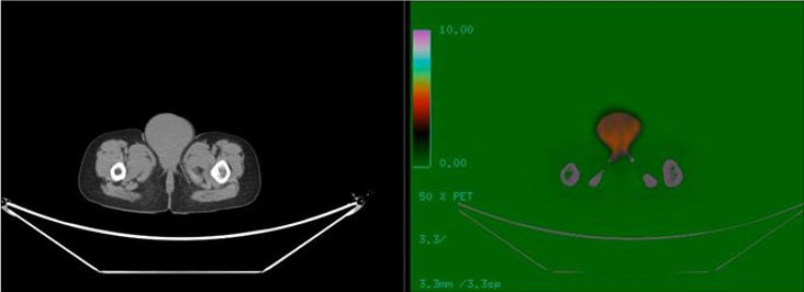 Magnetic resonance imaging (MRI) revealed an intact uterus, vagina, and ovary (Figure 2A and Figure 2B). In positron emission tomography/computed tomography (PET/CT), starting from the anterior of the symphysis pubis; increased fluorodeoxyglucose (FDG) uptake at the level of malignancy (SUVmax: 4.2) was detected in the soft tissue density mass (55×56×70 mm at its widest point) extending to the perineum (skin and subcutaneous), involving the bilateral labium majus, and having no boundaries with the vagina. The bladder and ureters were dilated and hydropic. It was evaluated as a PET/CT study compatible with malignant (SUVmax: 4.5) lymph nodes in the bilateral inguinal region, the largest of which was measured as 30×27 mm. Spleen and liver SUVmax (respectively 1 and 1.2) values were normal for her age (Figure 3A and Figure 3B). Biopsy from the genital area showed ALL infiltration into the skin and subcutaneous tissue with the same phenotype as the primary disease (proliferation of ALL cells). Reinduction chemotherapy was immediately started. Our patient was included in the bone marrow transplant program. During this period, the patient’s treatment was completed successfully.